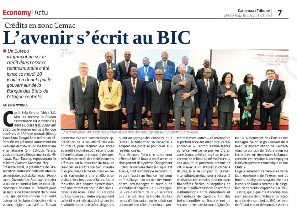 Le quotidien Cameroon Tribune met en lumière une avancée majeure pour l’écosystème financier de la zone CEMAC : le lancement officiel du Bureau d’Information sur le Crédit – Creditinfo Central Africa (BIC-CEMAC) à Douala.